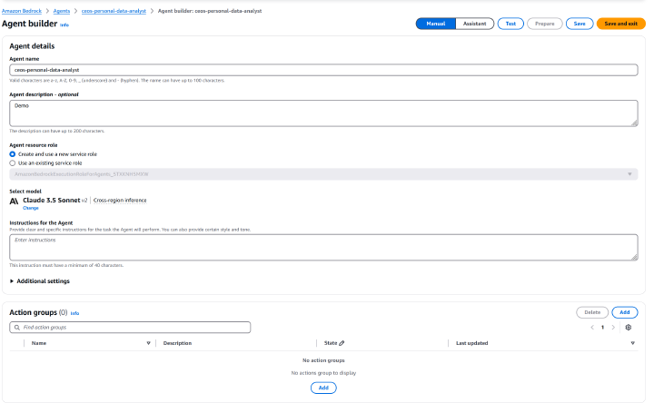 Here you need to select Brain [LLM Model], provide Instructions and define Action Groups = Tools available to Intern.