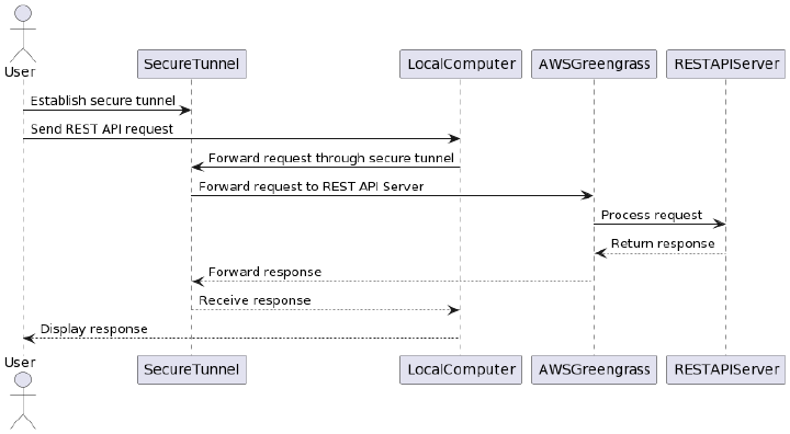 In Figure 1 diagram, the User initiates the workflow by sending a REST API request from their local computer. The request is then forwarded through a secure tunnel, established between the LocalComputer and the SecureTunnel component. The SecureTunnel acts as an intermediary, forwarding the request to the REST API Server deployed as a custom component on AWS Greengrass.